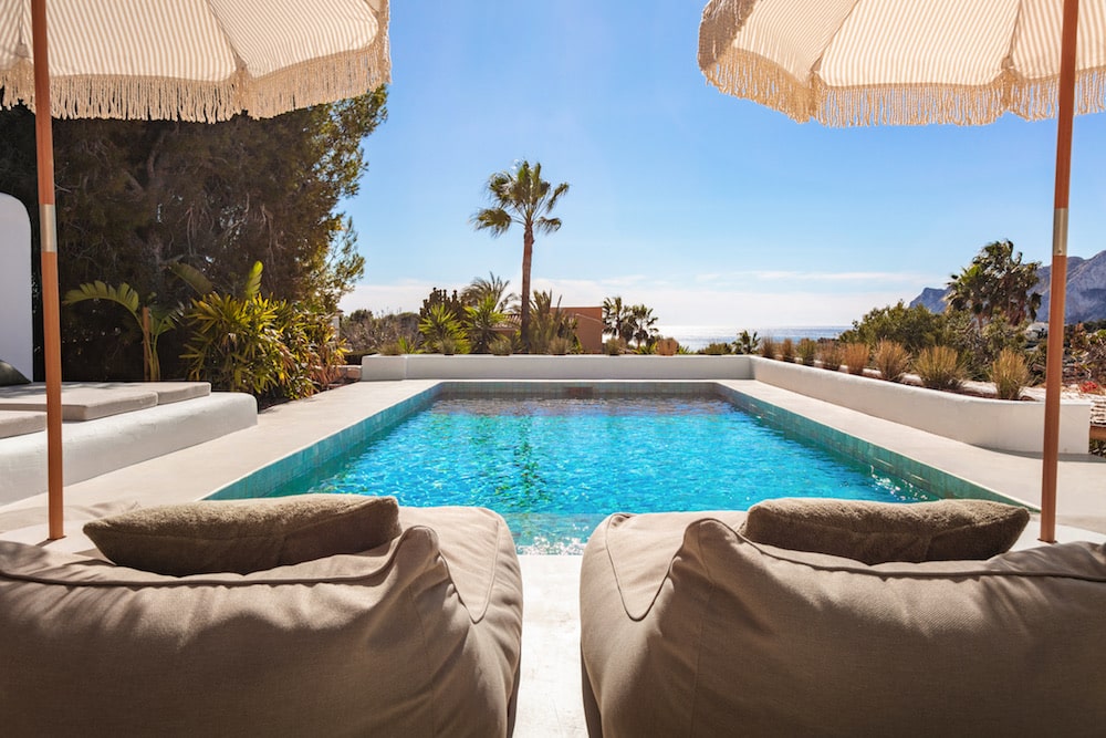 Het zwembad van La Madrugada biedt ultieme ontspanning met luxe ligbedden en panoramisch uitzicht tot aan zee. Grote schuifdeuren verbinden de living met het zwembadterras, waardoor binnen en buiten naadloos in elkaar overlopen. Een stijlvolle loungehoek en het overdekte terras maken dit de perfecte plek om te genieten.